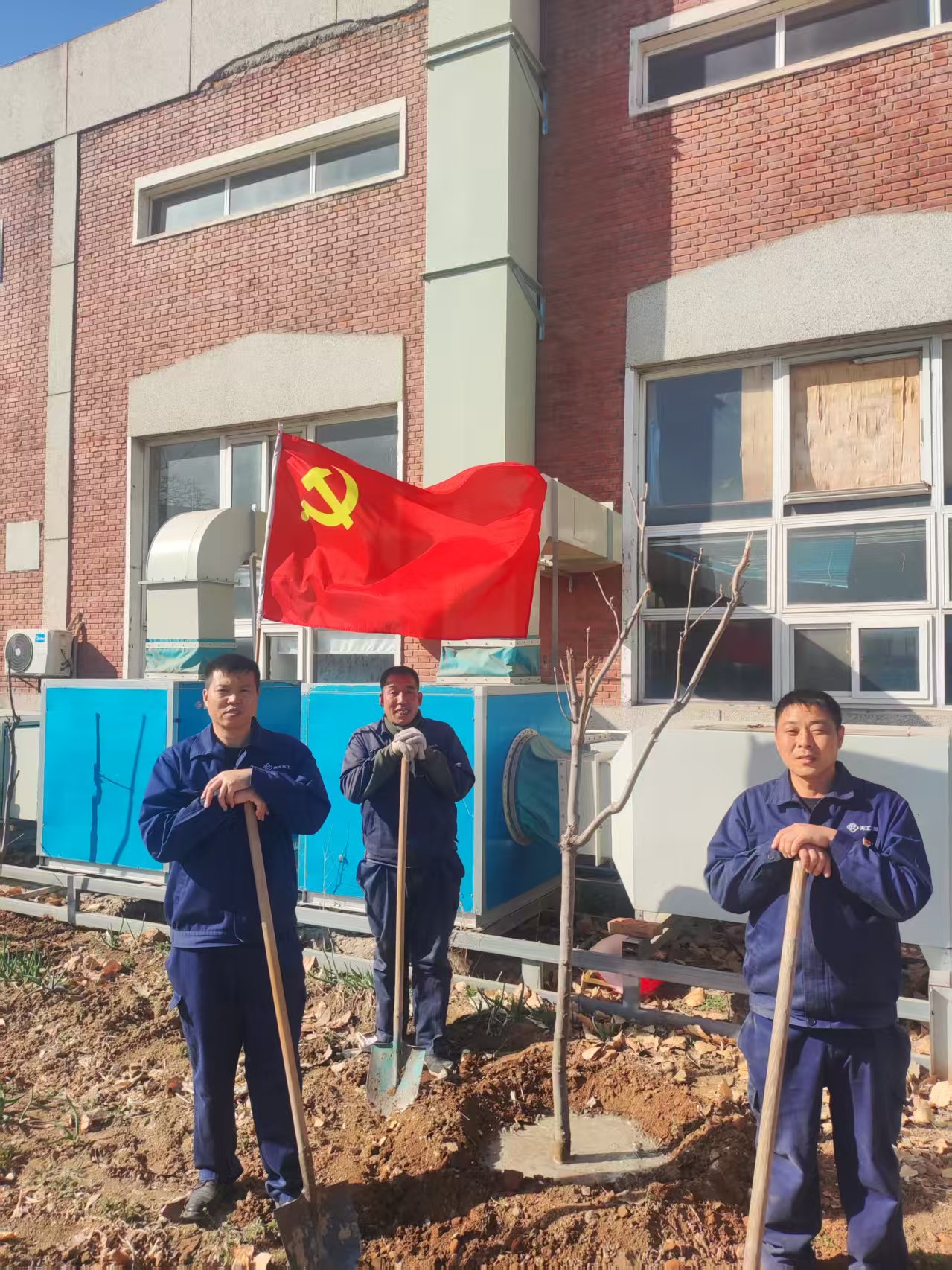 活動現場,黨員們佩戴黨徽、干勁十足,在專業人員指導下分工協作,揮鍬鏟土、扶苗培土、提水澆灌,黨旗飄揚與勞動熱情交織成春日奮進圖景。經過近一小時奮戰,新栽樹苗迎風挺立,為園區增添盎然生機。